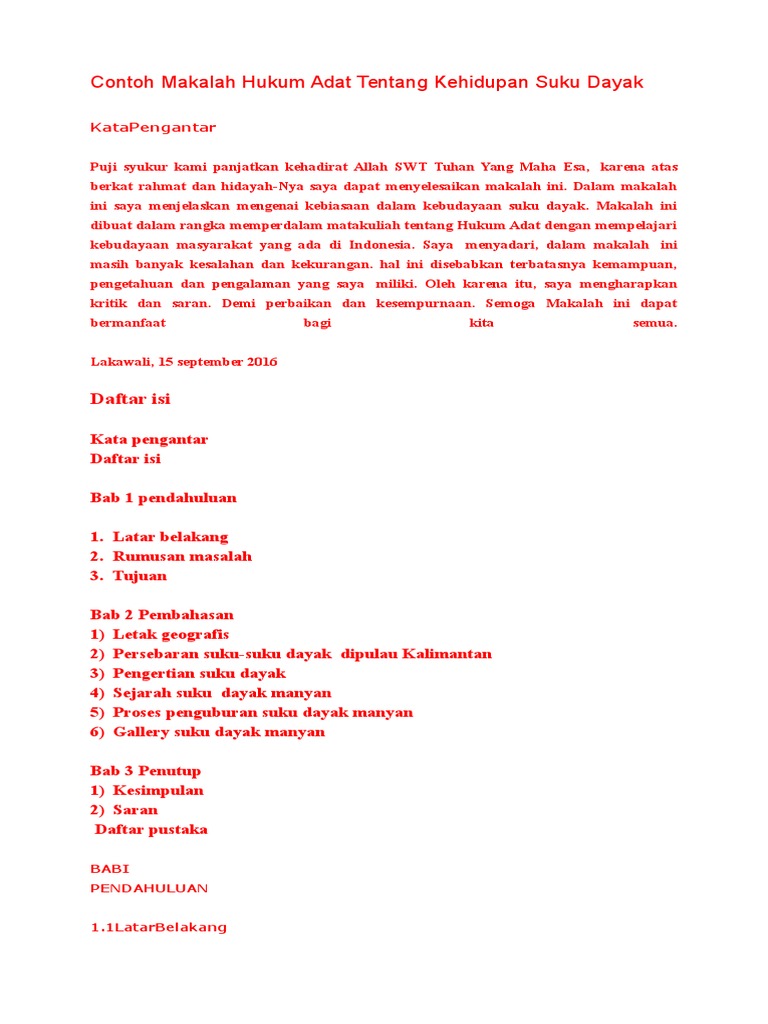 Contoh kata pengantar karya ilmiah. Adat, hukum perdata barat dan hukum. Menurut van vollenhoven, hukum adat adalah keseluruhan aturan tingkah laku masyarakat yang berlaku dan mempunyai sanksi dan belum dikodifikasikan. Contoh abstrak skripsi bahasa inggris. Tujuan penelitian ini untuk mendeskripsikan tema, amanat, alur, latar, sudut pandang, tokoh, dan penggambarannya pada novel dia, tanpa aku. Hukum adat mempunyai dua ciri, yaitu hukum yang tidak tertulis dan hukum yang tidak statis. Keberadaan hukum adat dan beberapa contoh hukum adat yang masih dianut masyarakat tersebut, membuka mata kita bahwa ternyata kepercayaan terhadap budaya dan adat masih sangat kental di berbagai daerah. Hukum tata negara mengatur hal hal terkait kenegaraan seperti bentuk bentuk dan susunan. Contoh hukum adat di bali yang dapat diuraikan disini adalah yang berkaitan dengan waris. Pemerintah hindia belanda pada tahun 1829 memaksakan kehendaknya dalam memberlakukan. Mulai dari skripsi hukum tentang perdata, pidana, ekonomi syariah, tata negara, keluarga, bisnis. Mereka ada secara paralel dengan sistem hukum formal sering meskipun ada kecenderungan untuk mengenali mereka secara formal. Beberapa negara menggunakan sistem hukum eropa kontinental dan beberapa lainnya selain negara itu, beberapa negara juga menerapkan sistem anglo saxon bersama dengan hukum adat dan hukum agama, seperti pakistan.